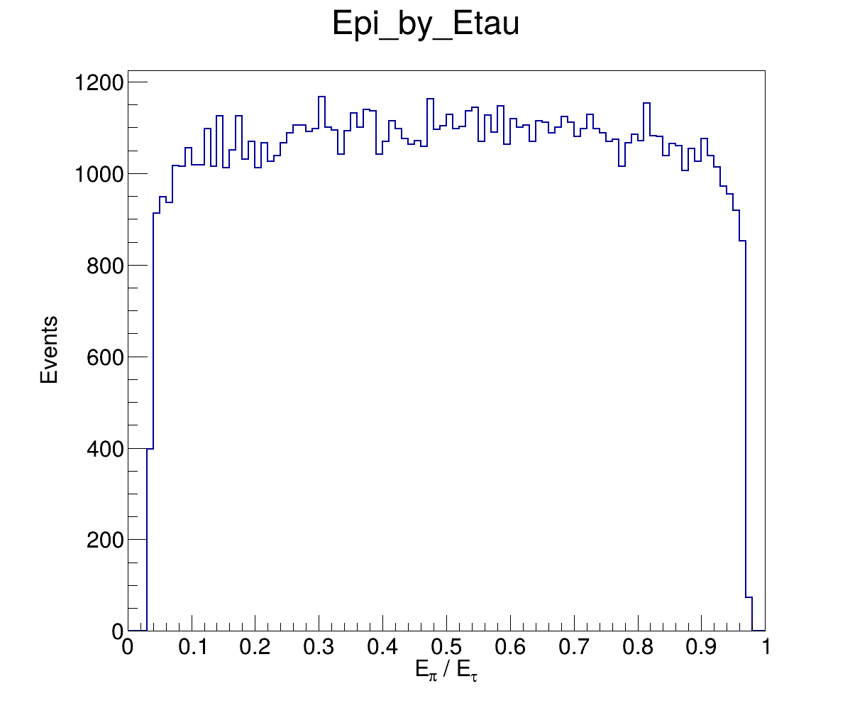 The histogram below shows the \(E_\pi/E_\tau\) distribution in the \(\tau\)-pair rest frame at \(\sqrt{s}=10.58\,\text{GeV}\) for the single-pion decay channel (To generate the single pion decay channel, set JAK variable in workMini.input to 159).