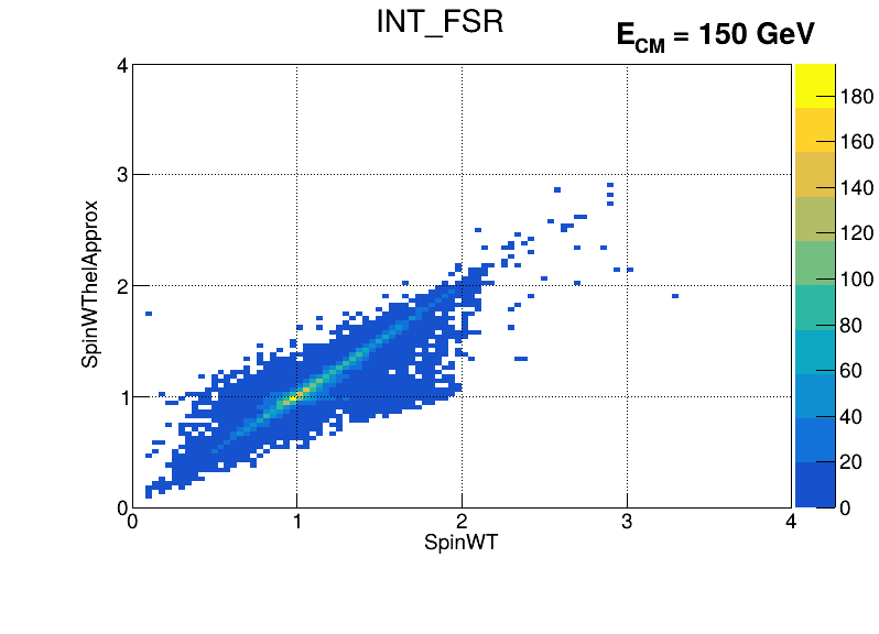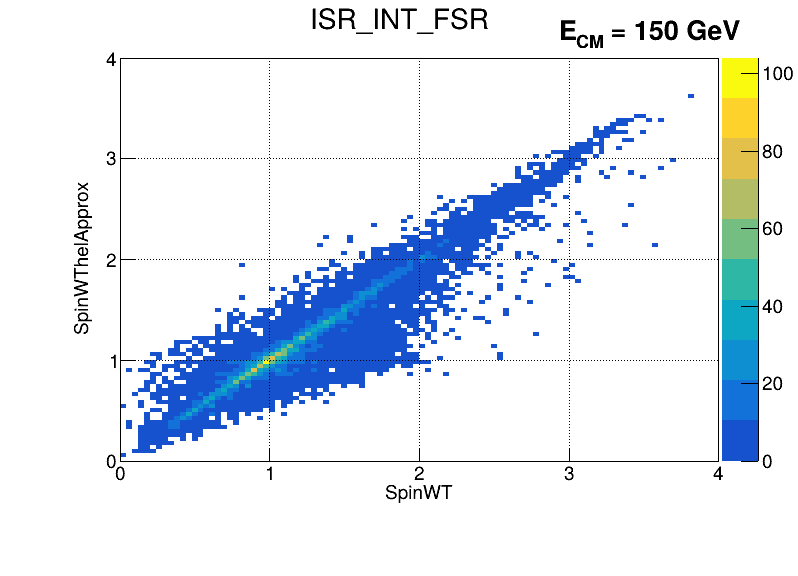Correlation between the spin weight as in KKMCee with the helicity approximated one at 150 GeV, when z-axes of its frames are used. (To generate the input for this run - In workMini.input, set parameter 1 (CMSene) to 150.0).