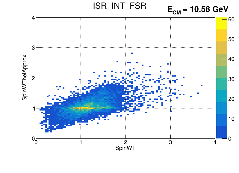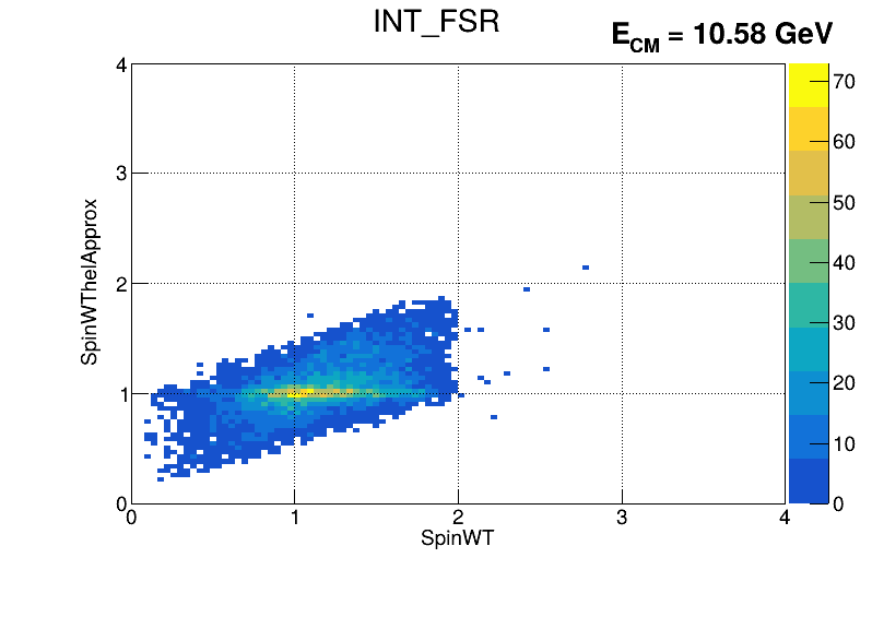 Correlation between the spin weight as in KKMCee with the helicity approximated one at 10.58 GeV, when z-axes of its frames are used. (To switch off the ISR, set parameter 20 (KeyISR) to 0).